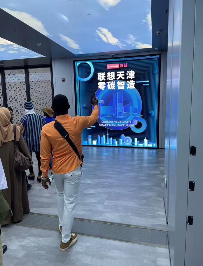Lenovo Tianjin Future Centre is a technology exhibition hall established by Lenovo Group, at the Tianjin Smart Innovation Industrial Park, with a total exhibition area of 6,900 square meters. International students first viewed the digital art exhibition displayed on a giant wraparound screen on the ground floor of the exhibition hall, experienced the fusion of Tianjin's history and modernity, technology and traditional culture.